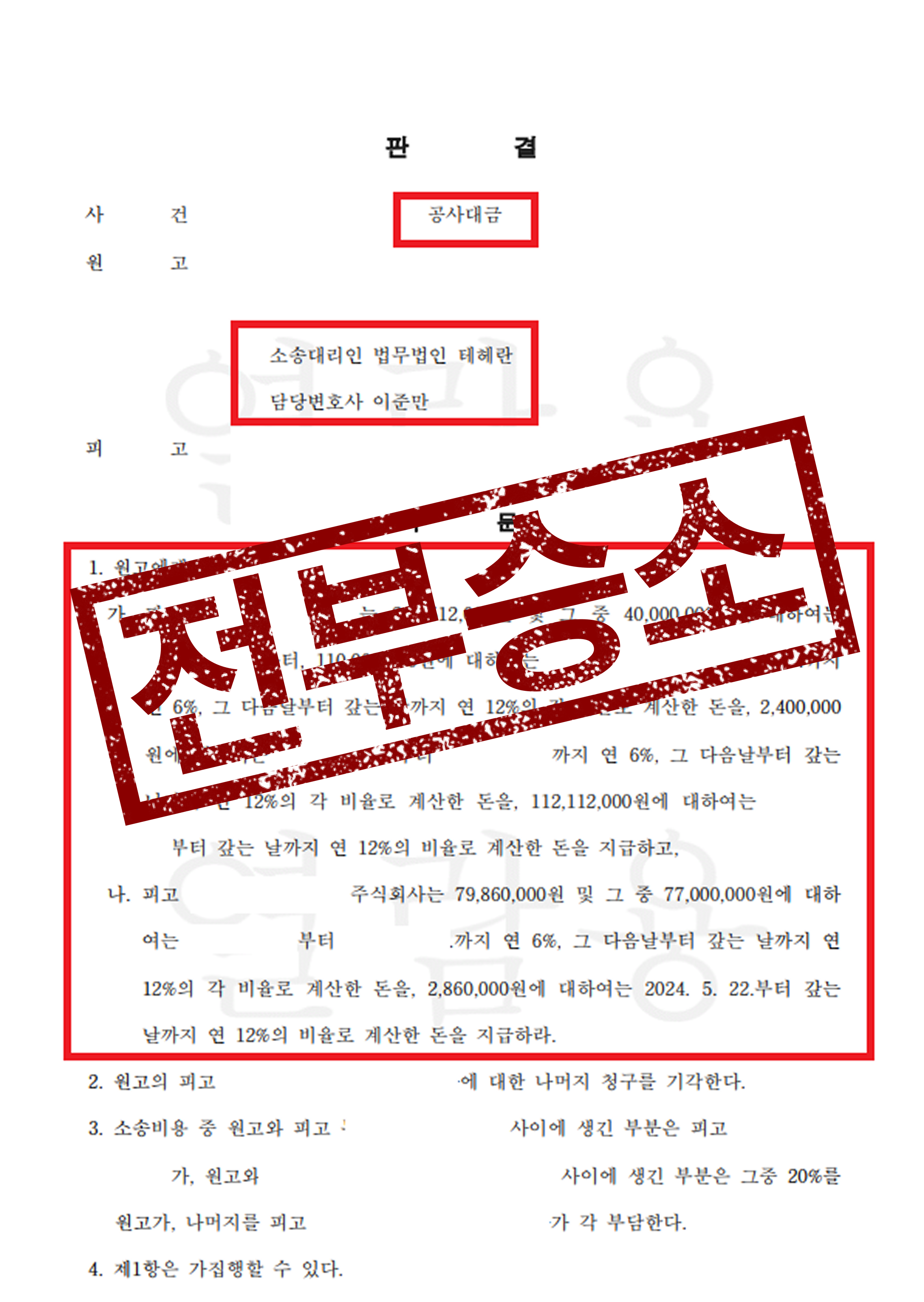 일부 감리비용을 제외한 나머지 청구는 모두 인용되어 실질적으로 의뢰인이 대부분 승소한 결과를 받아냈습니다.